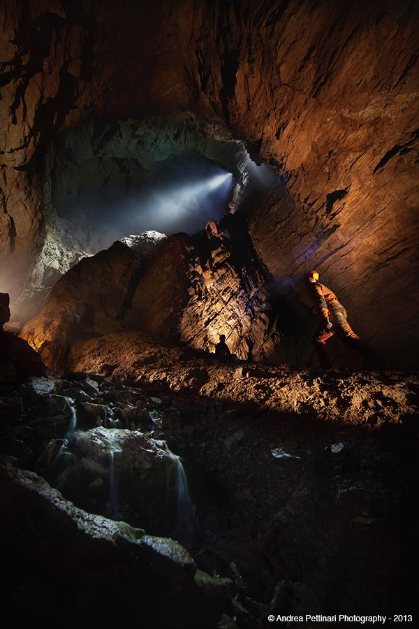 Questa suggestiva calata termina in una sala più larga dove la grotta si divide in due rami.