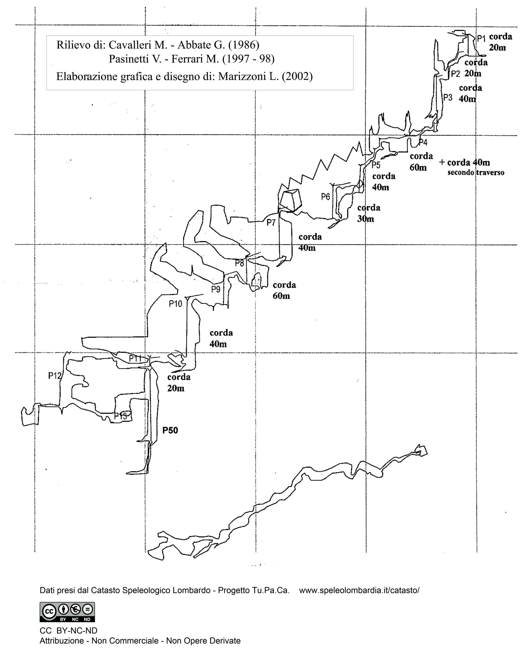 La grotta e’ stata esplorata e rilevata dall’Associazione Speleologica Bresciana; attualmente e’ armata dal Gruppo Grotte Brescia che sta proseguendo alcune esplorazioni in rami laterali.